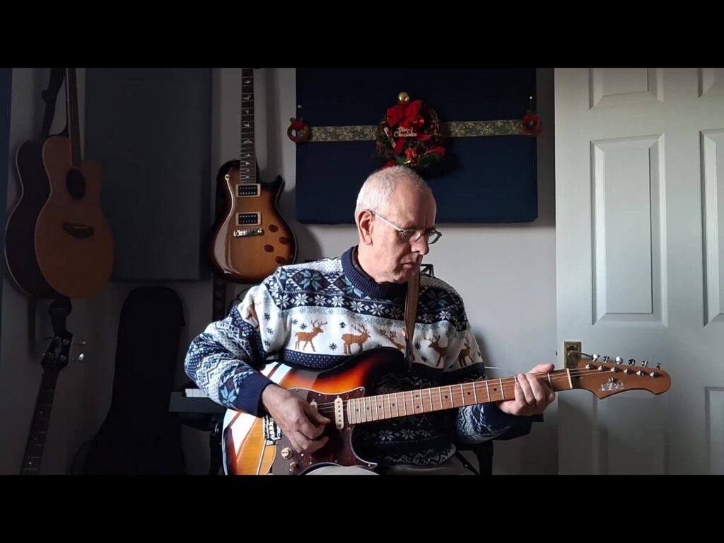 In the lead up to Christmas James Kuhel of Kirklees Guitar School has been running his annual ‘Riffmas’ competition. James provides a YouTube lesson and guitar tab PDF for a famous guitar riff. Facebook group members then submit clips of themselves attempting to play the riff. Each video clip that we share to the group earns one entry into a draw, this year to win a carbon fibre travel guitar or one of two guitar pedals. As I’m trying to learn some lead guitar I decided to give it a go, even though the chosen riffs are outside my normal musical tastes, some massively so! None are from songs that I have ever played, sung or aspired toward.
