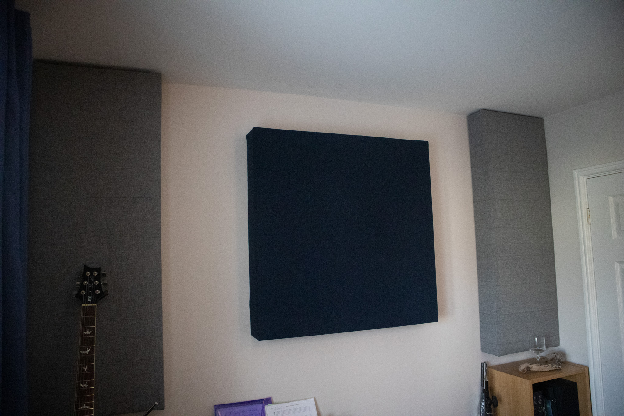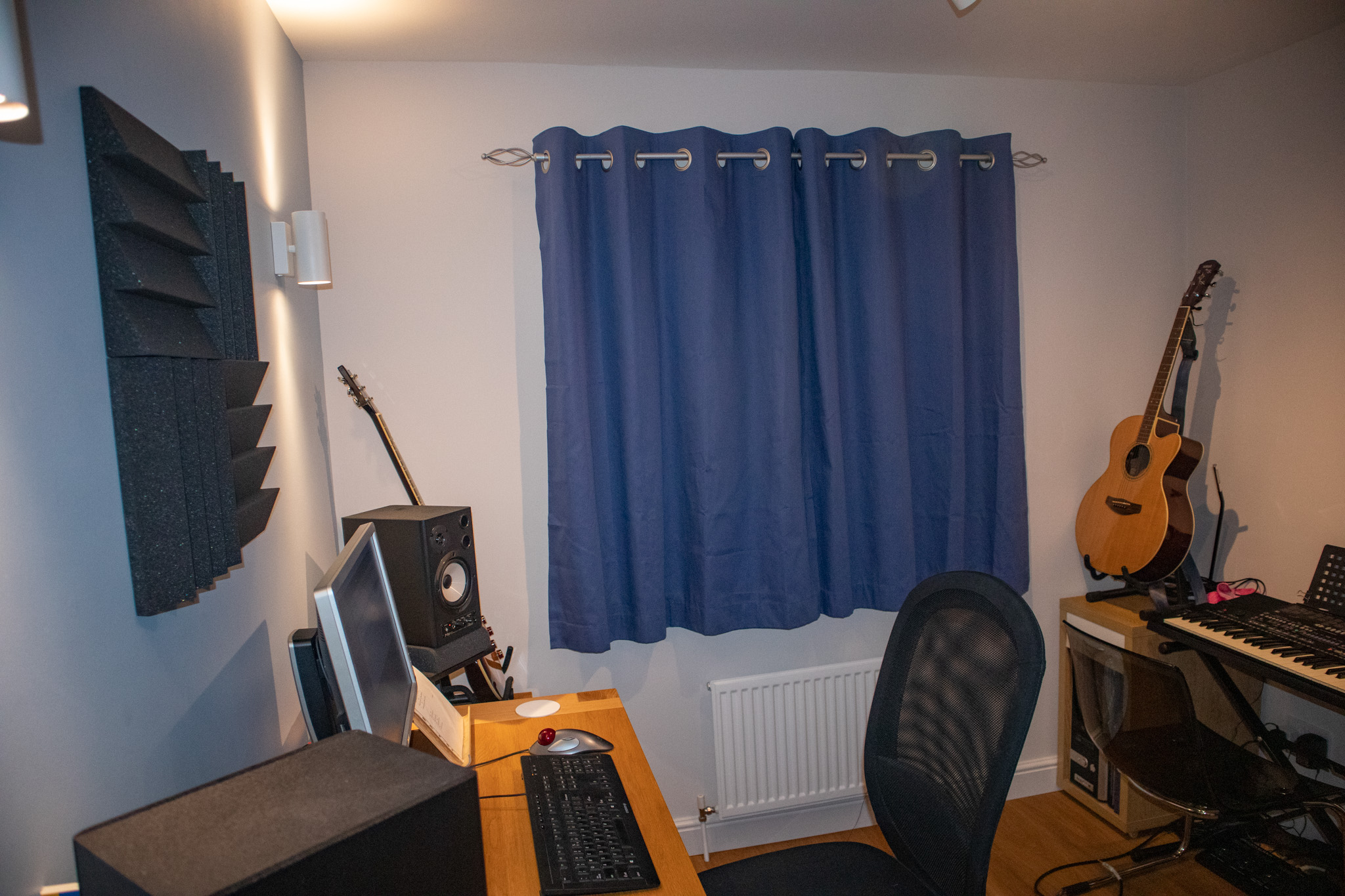 Hangers for my guitars & cables were then fixed to the walls. Finally, I added thicker curtains and a carpet mat before moving my desk, speakers and the remainder of my musical gear in.